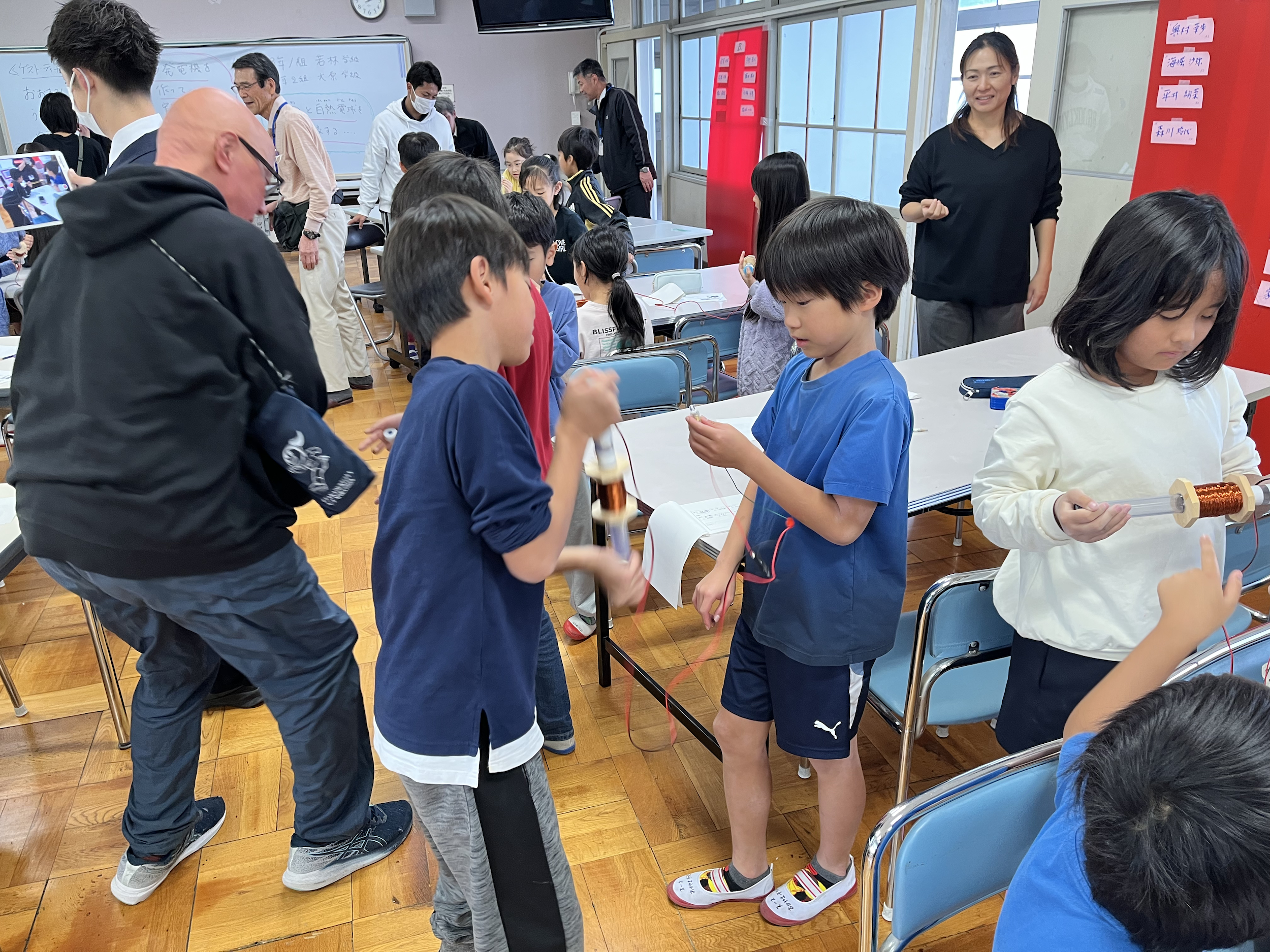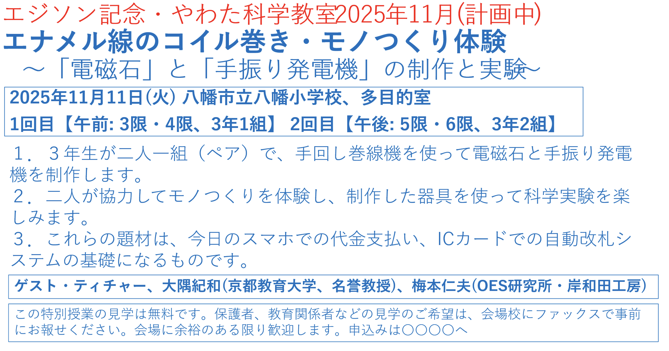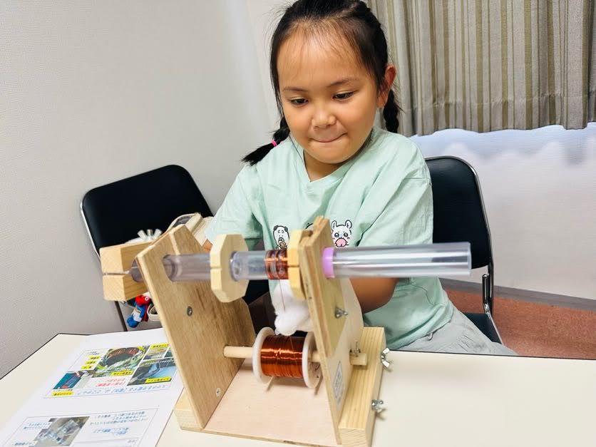 この巻線機で、難しくて厄介とされてきた電磁誘導の実験は、小学生の低学年でも楽しく扱えるものになった。